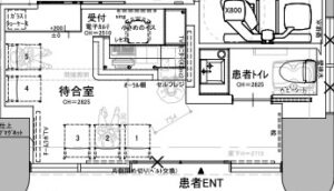 今回は「受付・待合まわりの設計」について。工事中の現場だけだと完成形が伝わりにくいので、受付のパース図面(受付部分)をあわせてご紹介します。