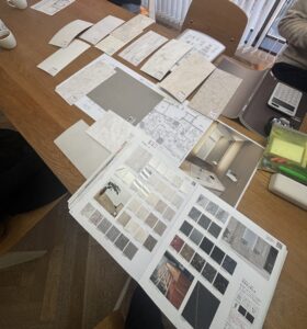 前回掲載した受付パースは「完成イメージ」です。今回の打ち合わせは、そのイメージを現実の素材と光で再現できるように詰めていく工程です。