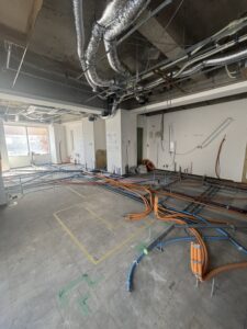患者さんからは見えにくい部分ですが、配管・配線・空調、そして空間の区分や動線の組み立ては、完成後の“安心感”に直結します。今回は、工事中の写真(配管 → 床あげ・骨組み)2枚を使って、その考え方をお伝えします。